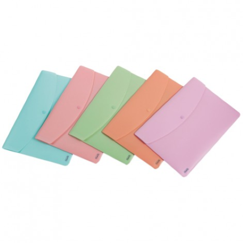Buste con bottone pastello. Formato A4 realizzate in polipropilene opaco in 5 colori pastello: verde, arancio, lilla, rosa, azzurro. Chiusura con bottone a pressione in tinta.