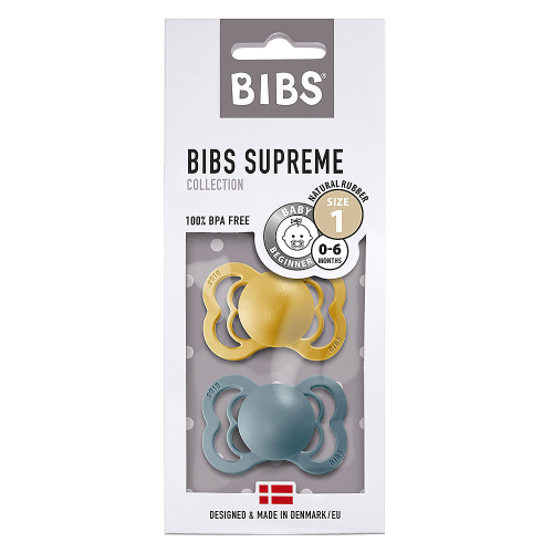 Bibs Supreme è il nuovo ciuccio dal moderno design approvato dai tester più esigenti: i bebè. Creato dal marchio Danese Bibs e Made in Danimarca, è un ciuccio la cui forma è studiata per assicurare il passaggio dell’aria, così la pelle intorno alla bocca del bèbè rimane asciutta riducendo il pericolo di irritazioni. La tettarella, dalla forma simmetrica, è disegnata per supportare lo sviluppo della mascella del bambino e ridurre al minimo la pressione esercitata nei dentini!I materiali sono tutti di qualità: tettarella in gomma naturale, mascherina in polipropilene leggero, 100% privi di BPA, PVC e ftalati, per un ciuccio leggero, resistente e ultra sicuro!