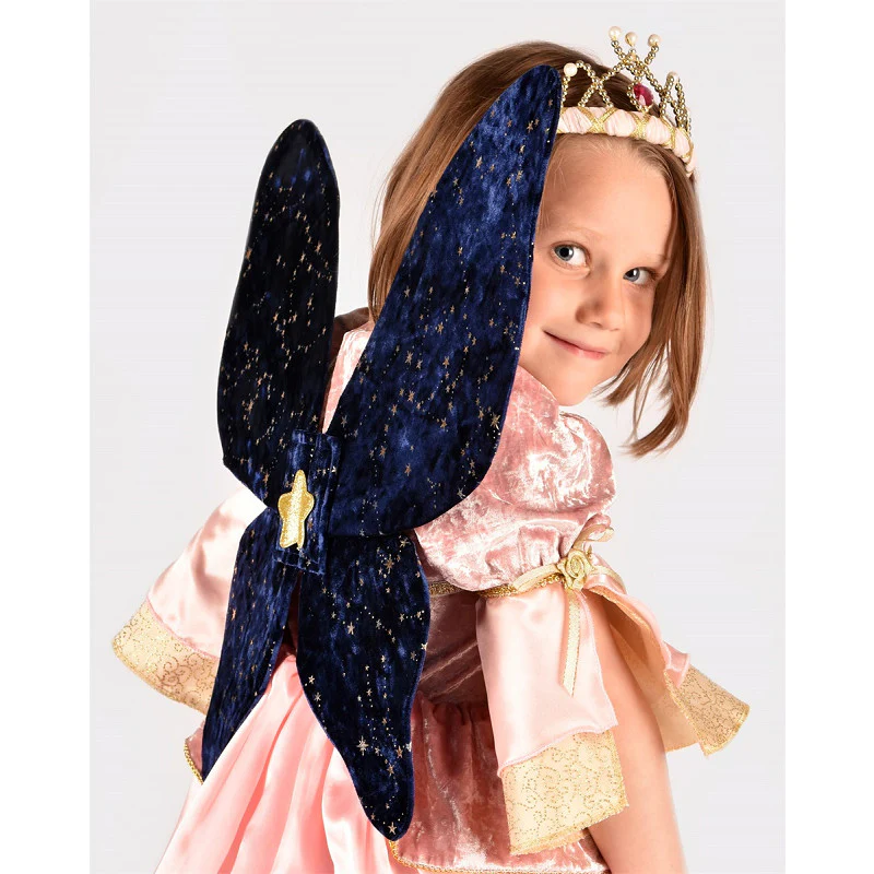 Ali in velluto con stelle dorate stampate. Stella glitterata al centro. Spalline elastiche dorate.