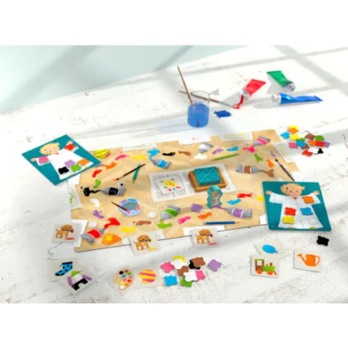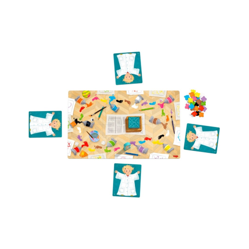 L’apprendista pittore e i tubetti di colore L’apprendista pittore e i tubetti di colore – Klecks dipinge splendidi quadri colorati. Ma il piccolo pittore ha bisogno di tantissimi colori! I bambini passano in rassegna con Klecks i vari tubetti scoprendo le carte illustrate e nominando i colori. Così collezionano tanti pallini colorati come souvenir. Ma attenzione: il cane Toffy ruba i pennelli! Vince il primo che riesce a raccogliere sette pallini sul suo camice.