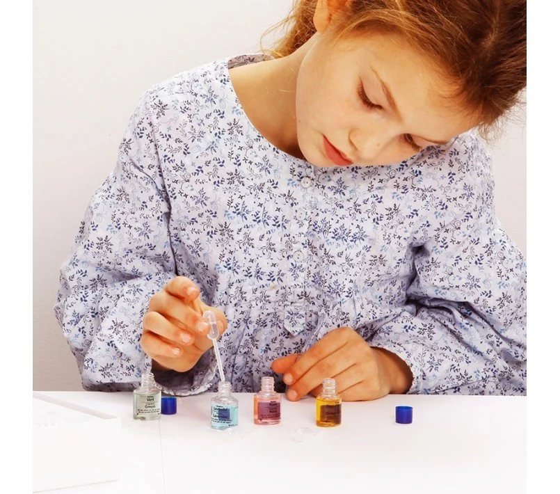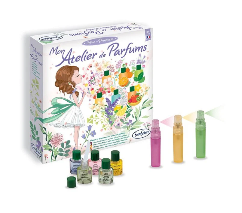 Un divertentissimo kit per creare deliziosi profumi personalizzati! La scatola contiene 8 essenze da 6 ml (fragranza muschiata, fragranza fruttata, arancio, mughetto, limone, fragranza verde, lavanda e fiori d’arancio), 8 pipette, 1 confezione di cartoncini per testare le fragranze, 3 flaconi e 3 vaporizzatori, 1 guida del profumiere.