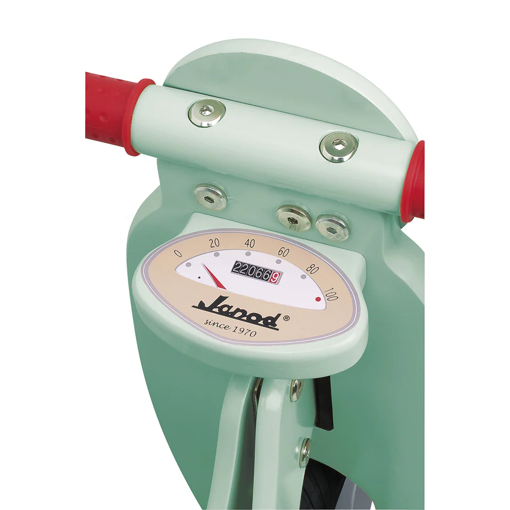 Questa bici senza pedali in legno in stile scooter vintage, e colore menta, aiuta a trovare e padroneggiare l’equilibrio prima di salire sulla sua prima bici a pedali.