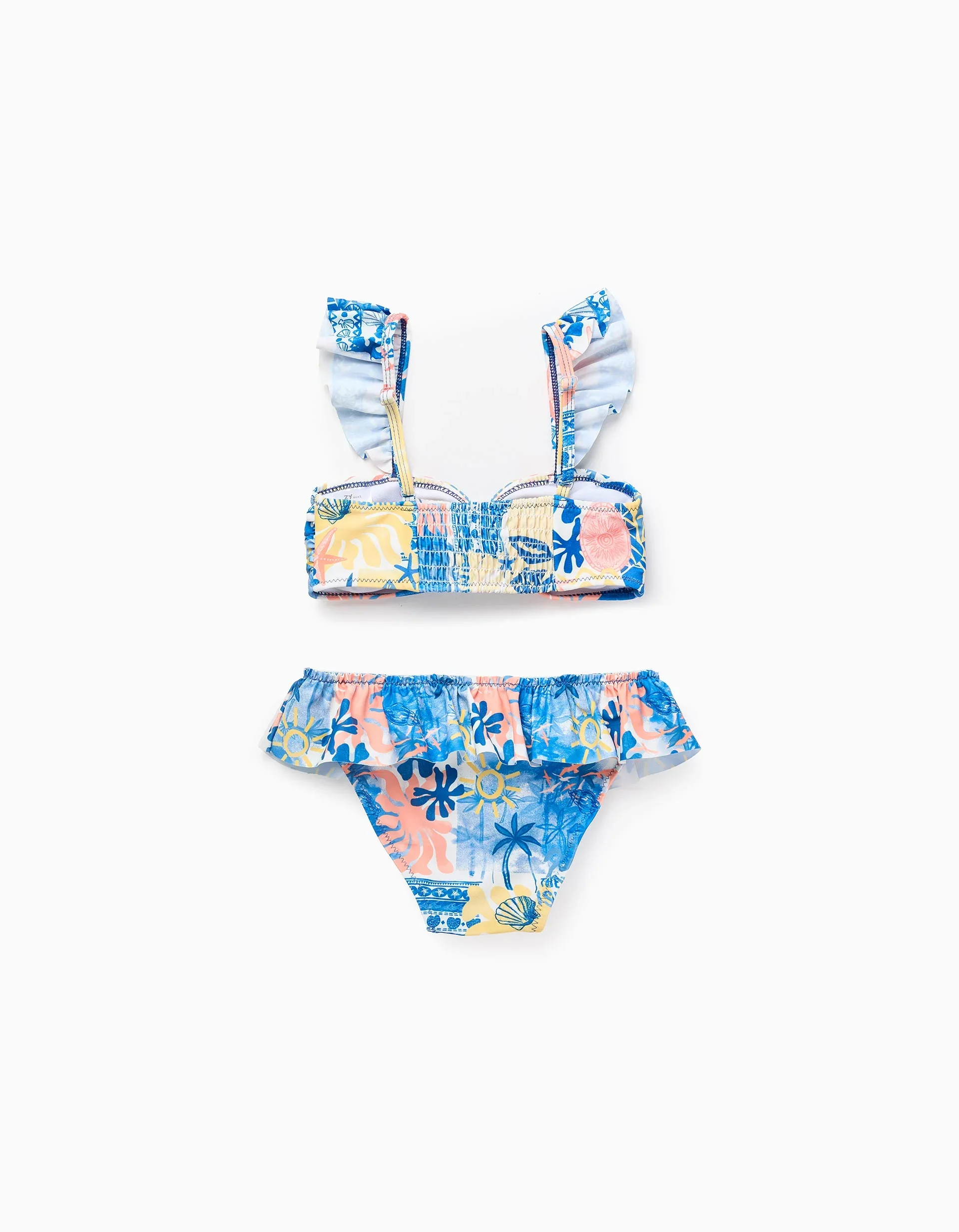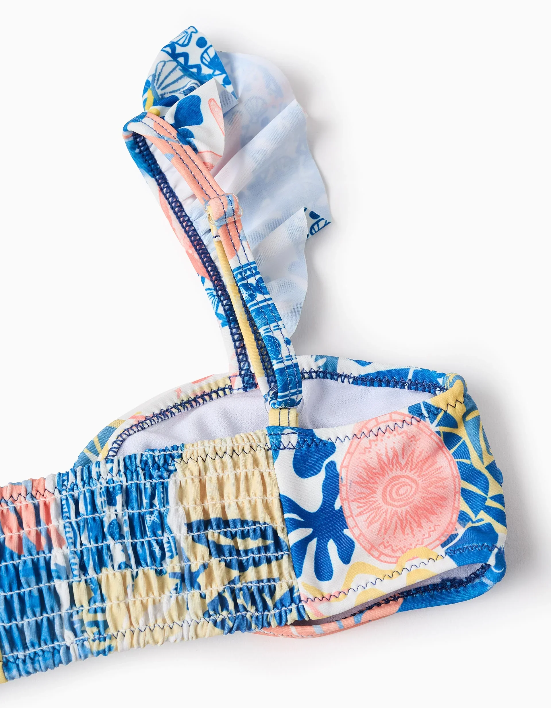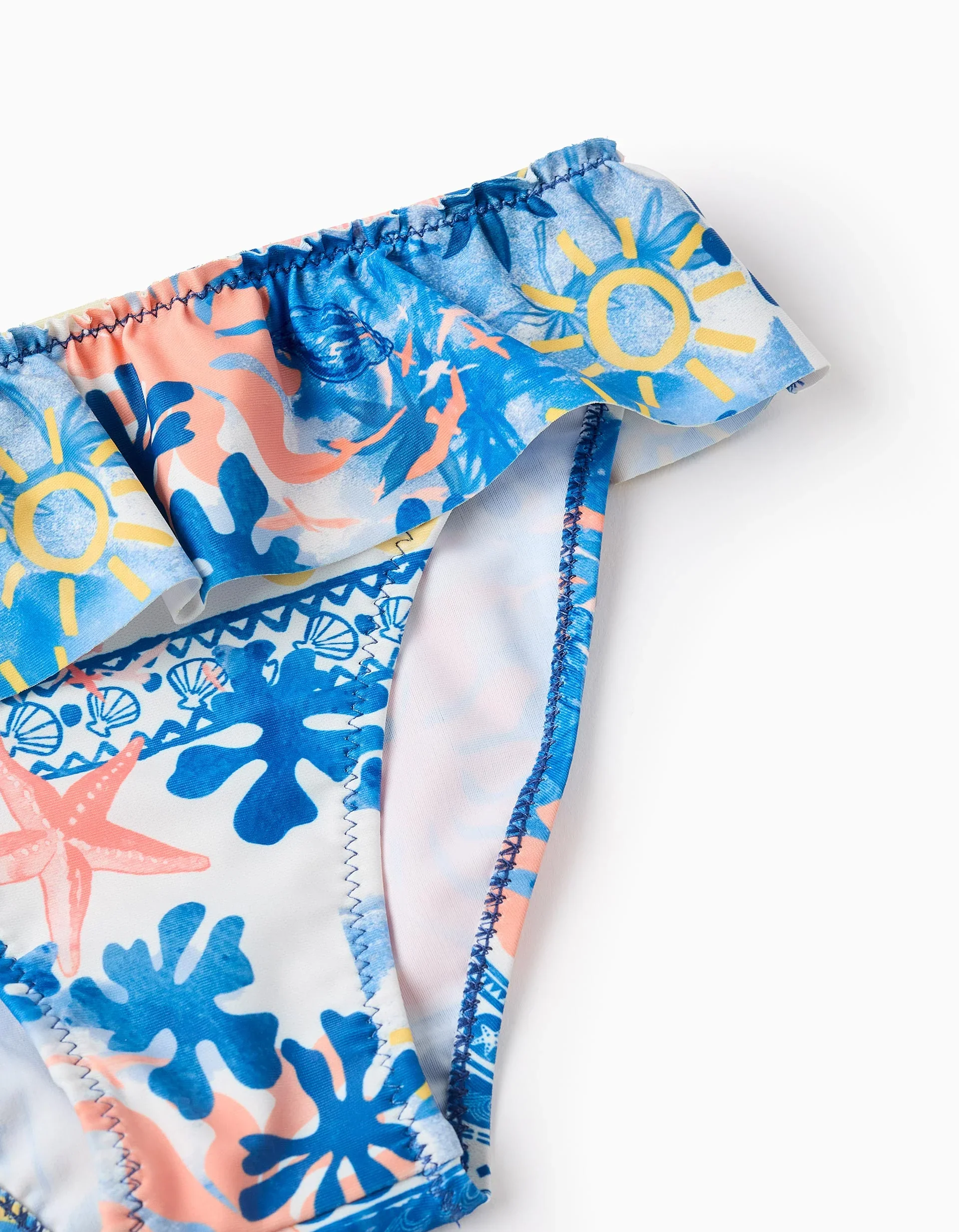 Bikini stampato nei toni del blu, arancione e giallo per bambine. Top con fiocco decorativo, spalline regolabili con volant ed elastico arricciato sul retro. Slip con volant in vita. Con fodera per un maggiore comfort. Un bikini originale con un tema marino di alghe e stelle marine.
