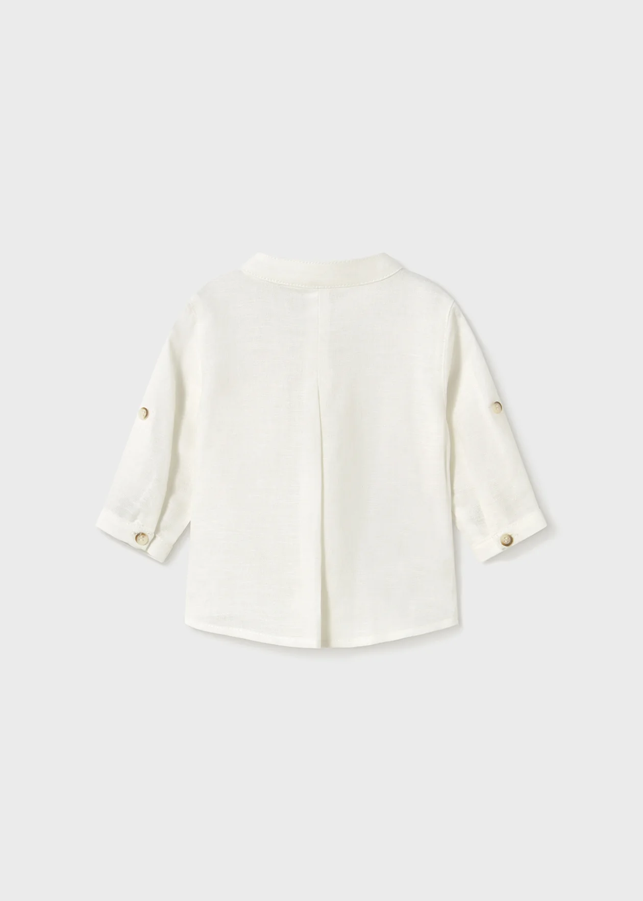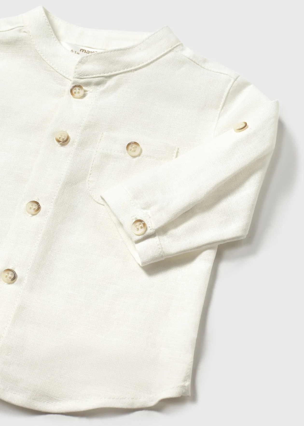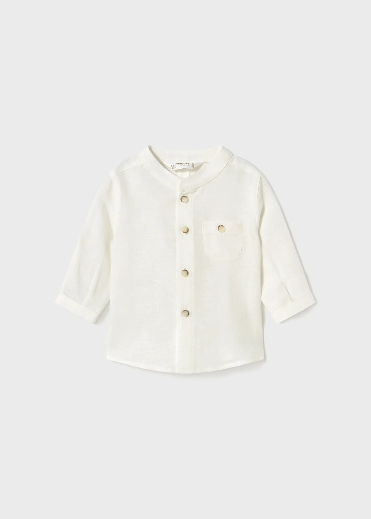 Camicia a manica lunga per noenato con colletto alla coreana ton sur ton. Chiusura con bottoni nella parte anteriore e tasca funzionale sempre nella parte anteriore.Disponibile nelle taglie da 2-4 mesi a 18 mesi 66% Cotone34% Lino