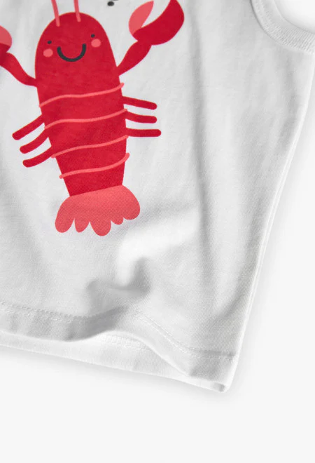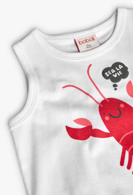 Canotta ideale per i mesi caldi. Realizzata in un materiale morbido e leggero, offre comfort e freschezza durante l’uso quotidiano. Il suo colore bianco mette in risalto una divertente stampa di un crostaceo in tonalità rosse, aggiungendo un tocco vivace al capo. Disponibile nelle taglie da 2 anni a 6 anni