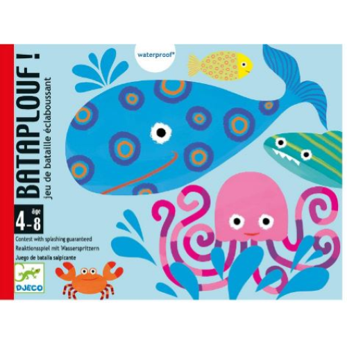 Gioco di carte BATAPLOUF decorate con illustrazioni divertenti a tema creature marine, di Djeco. Simpatici pesci stampati su carte in plastica… 5 animali marini nuotano nella vasca. In caso di lotta, vince le carte chi afferra per primo l’animale giusto. Contiene un sacchetto a rete per far asciugare le carte. Prodotto dalla francese DJECO, azienda specializzata in giochi creativi e materiali educativi per bambini. Contenuto: 20 + 5 carte.