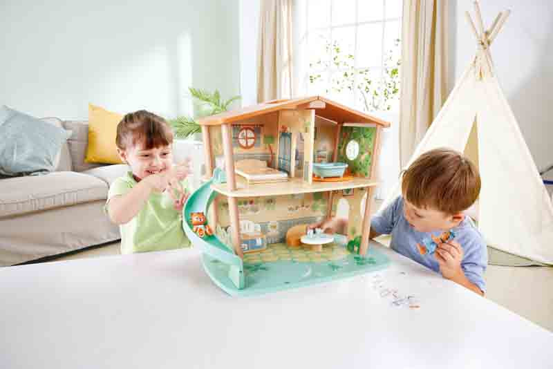 La casa ecologica nella giungla e le sue due tigri sono un ottimo modo per avvicinare i bambini alla vita sostenibile. Incoraggiali a immaginare modi per proteggere il mondo naturale per le future generazioni.