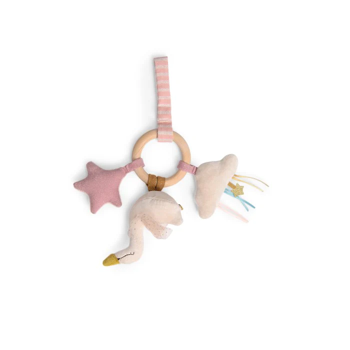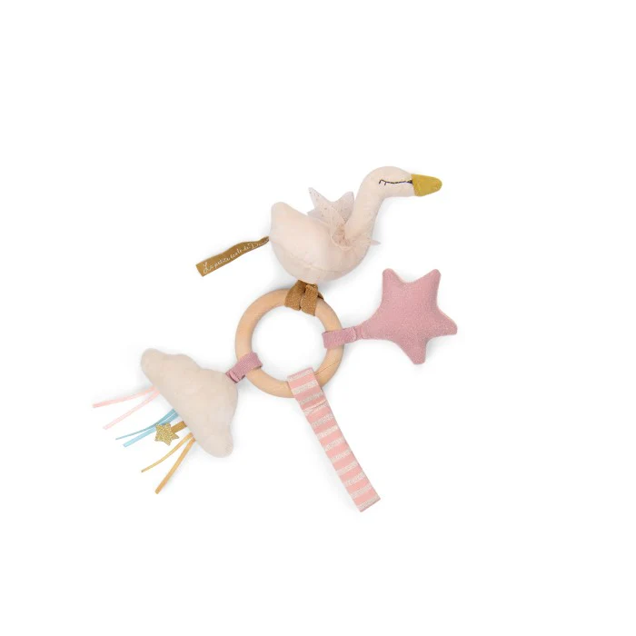 Sonaglio 2 in 1, cigno da coccolare e giocattolo per attività per il bambino! Realizzato con materiali diversi e un anello di legno naturale. Quando viene scosso produce un gradevole suono di campanella e un rumore di carta stropicciata. Può essere appeso utilizzando il velcro.