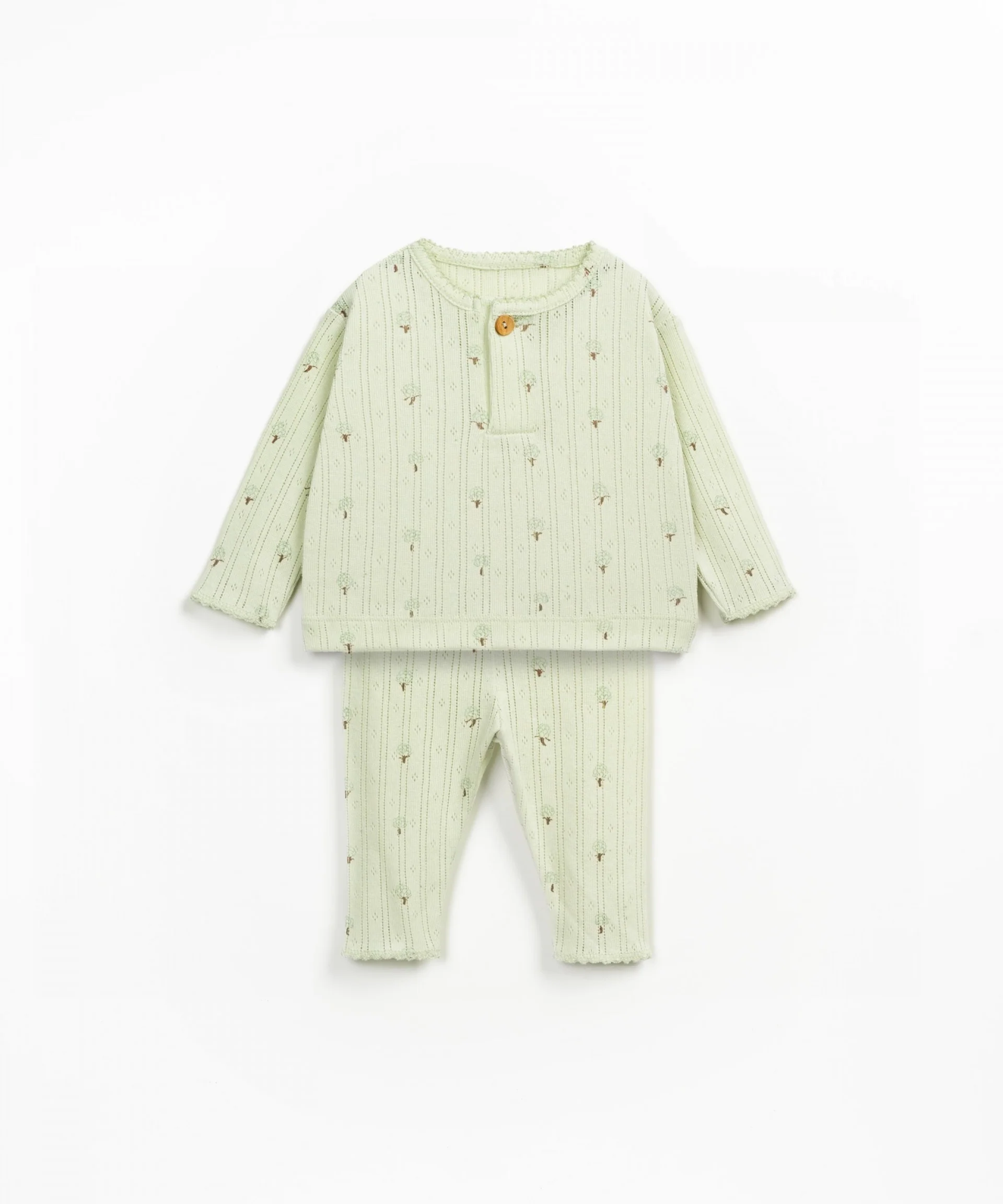 Completo composto da una maglietta a maniche lunghe e pantalone. La maglietta ha uno scollo rotondo, un’apertura frontale con bottone in cocco, mentre i pantaloni presentano un motivo a righe sottili e un orlo ondulato.