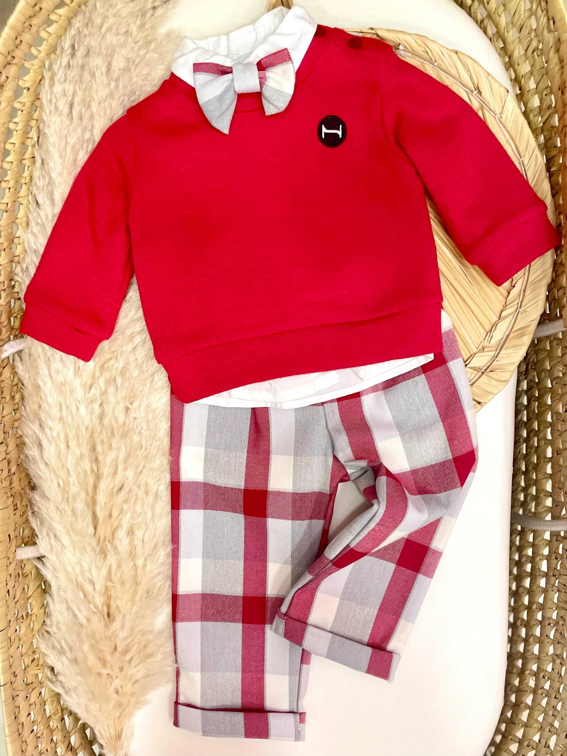 Completo composto da pantalone, cintura, camicia, felpa e papillon