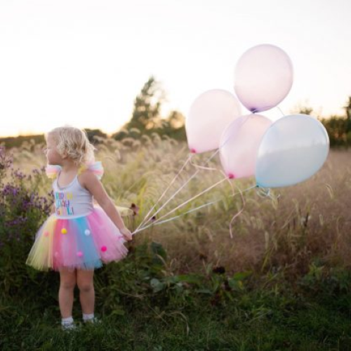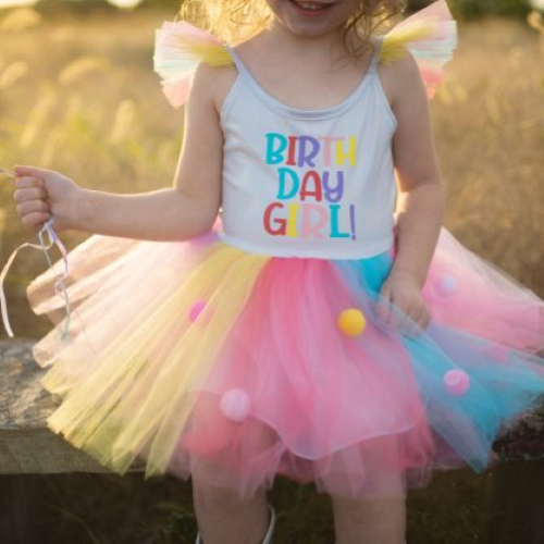 Festeggia la festeggiata con stile! Il nostro vestito tutù di buon compleanno presenta strati di tulle rosa, blu e giallo ed è ricoperto di pon pon multicolori per un divertimento extra! La parte superiore e le spalline sono realizzate in spandex elasticizzato con sbuffi di tulle sulle spalle per completare il look. Età consigliata: Taglia 4-5