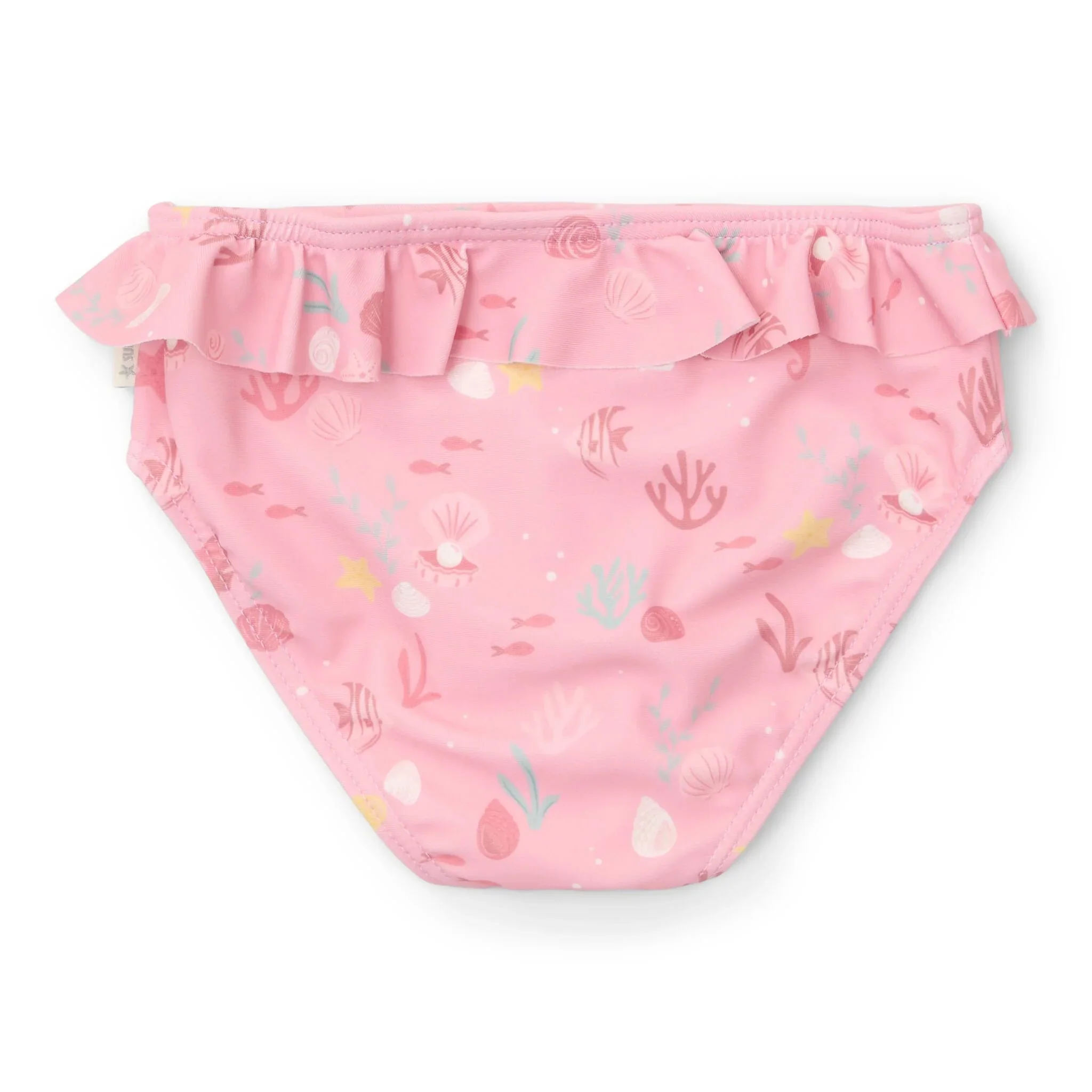 Tuffati nell’avventura e goditi l’acqua rinfrescante! Che sia in piscina o al mare, lascia che l’acqua sia il tuo parco giochi. Questo costume da bagno assicura comfort in ogni movimento, sia che tu stia nuotando o giocando. Questo slip ha una bellissima base rosa chiaro con pesci e coralli ovunque e rende le giornate estive in riva al mare ancora più soleggiate. Le graziose balze lungo la vita danzano con ogni movimento della tua piccola mentre gioca in acqua.