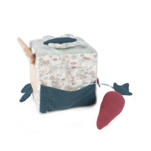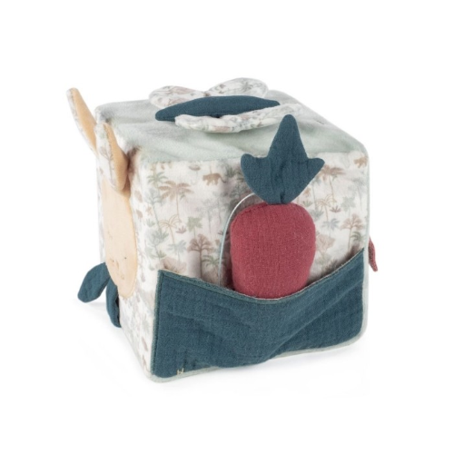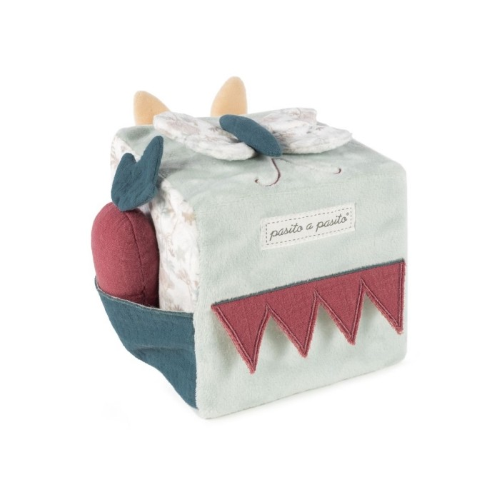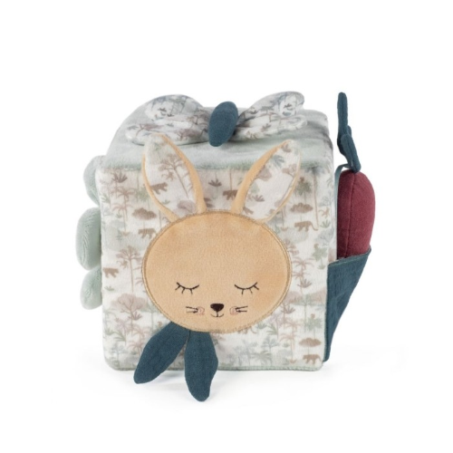 Morbido cubo attività con coniglietto per stimolare il bambino durante il gioco. Per giocare e scoprire suonerie e suoni diversi. Ha anche uno specchio per la scoperta di sé. Prodotto in conformità con le norme sulla sicurezza dei giocattoli EN-71. Misure: 12,5 x 12,5 x 12,5 cm.