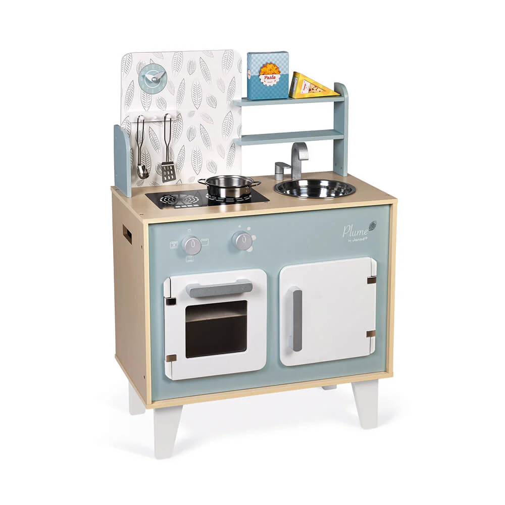 Grazie a questa bella cucina Plume, i vostri bambini potranno divertirsi a preparare dei piatti squisiti! Dotata di tutti gli accessori necessari per diventare un grande chef: i ganci per appendere il mestolo per spaghetti e la spatola in metallo, una pentolina di metallo e 2 confezioni in cartone indispensabili, una di pasta e l’altra di formaggio. Per accendere i piani cottura a induzione, giriamo le 2 manopole rotanti con effetti sonori! Questa cucina per bambini è anche dotata di un forno, un armadietto con porte magnetiche, un lavello in acciaio inox e un orologio. Altezza del piano di lavoro: 50 cm.