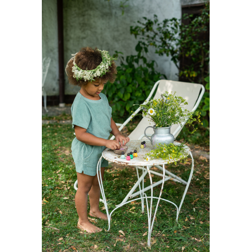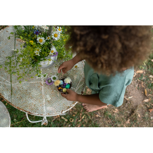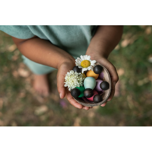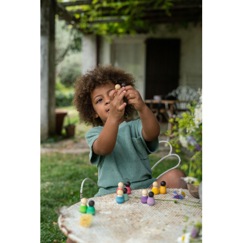 Contiene 6 piccoli Nin e 1 guscio di cocco 6 Nins scuri in miniatura in 6 colori complementari. Possono essere abbinati ai classici Nin & Adult Nin, che essendo più piccoli e più alti di questi, e con una diversa tonalità di pelle, possono facilitare una proposta di gioco dove intervengono generazioni ed etnie diverse. Il guscio della noce di cocco contiene, trattiene. Un contenitore che può essere una perfetta culla, un lettino o qualsiasi cosa i bambini allestiscano con la loro fantasia.