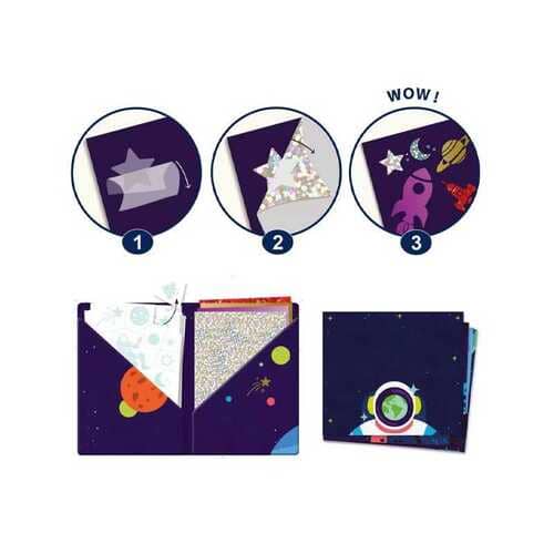 Grazie ai tasselli magici i bimbi potranno decorare e arricchire le tavole, creando effetti super super spaziali grazie alle brillanti sagome in colori metallizzati! Una volta realizzati i quadretti, diventeranno bellissime decorazioni per la cameretta.