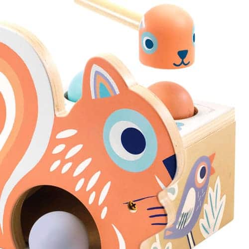 Consiste di due parti unite tra loro: c’è un grazioso scoiattolo e c’è una deliziosa scatolina, contenente 3 noci in legno. Vogliamo aiutare il piccolo scoiattolo a mangiare le sue noci? Allora, dotati di martelletto, picchiamo sulle noci per farle scendere giù attraverso la scatolina: così faremo felice il nostro amichetto!