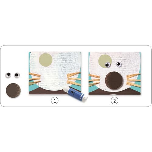All’interno della confezione troverai tutto l’occorrente per aiutare il tuo bambino a realizzare bellissimi collage. Il piccolo dovrà completare i quattro cartoncini in dotazione che sono illustrate con semplici e scarne sagome di animaletti. Nelle buste ci sono le decorazioni per realizzare i suoi primi grandi capolavori. Potrà completare i visetti degli animali, il manto e le espressioni facciali con gli stickers in dotazione, da apporre negli appositi spazi con la colla stick. La colla si può usare anche con le mani perché è atossica. Una volta completate le cartoline, esse diventeranno dei bellissimi oggetti di decorazione per la cameretta da esporre con orgoglio!