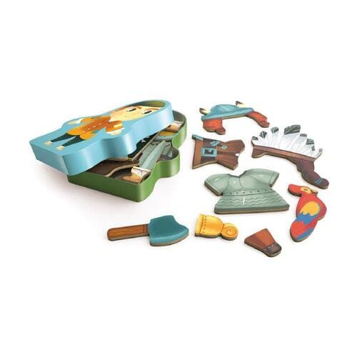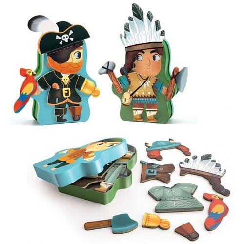 Nella bella confezione sagomata in metallo sono contenute tante figurine con cui dare sfogo alla propria fantasia. Con le 27 tessere magnetiche si possono assemblare pirati, indiani e tanti personaggi che incarnano lo spirito di avventura, corredati da tutti gli accessori e dall’abbigliamento adatto.