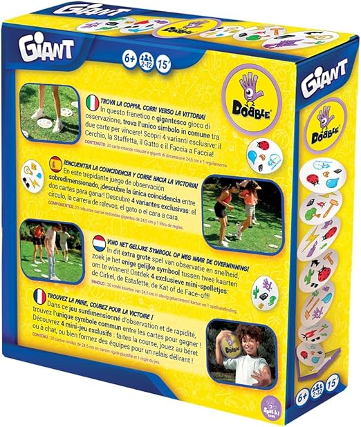In questo frenetico e gigantesco gioco di osservazione, trovate l’unico simbolo in comune tra due carte per vincere! Dobble Giant include 4 mini‑giochi unici, due dei quali si giocano a squadre!