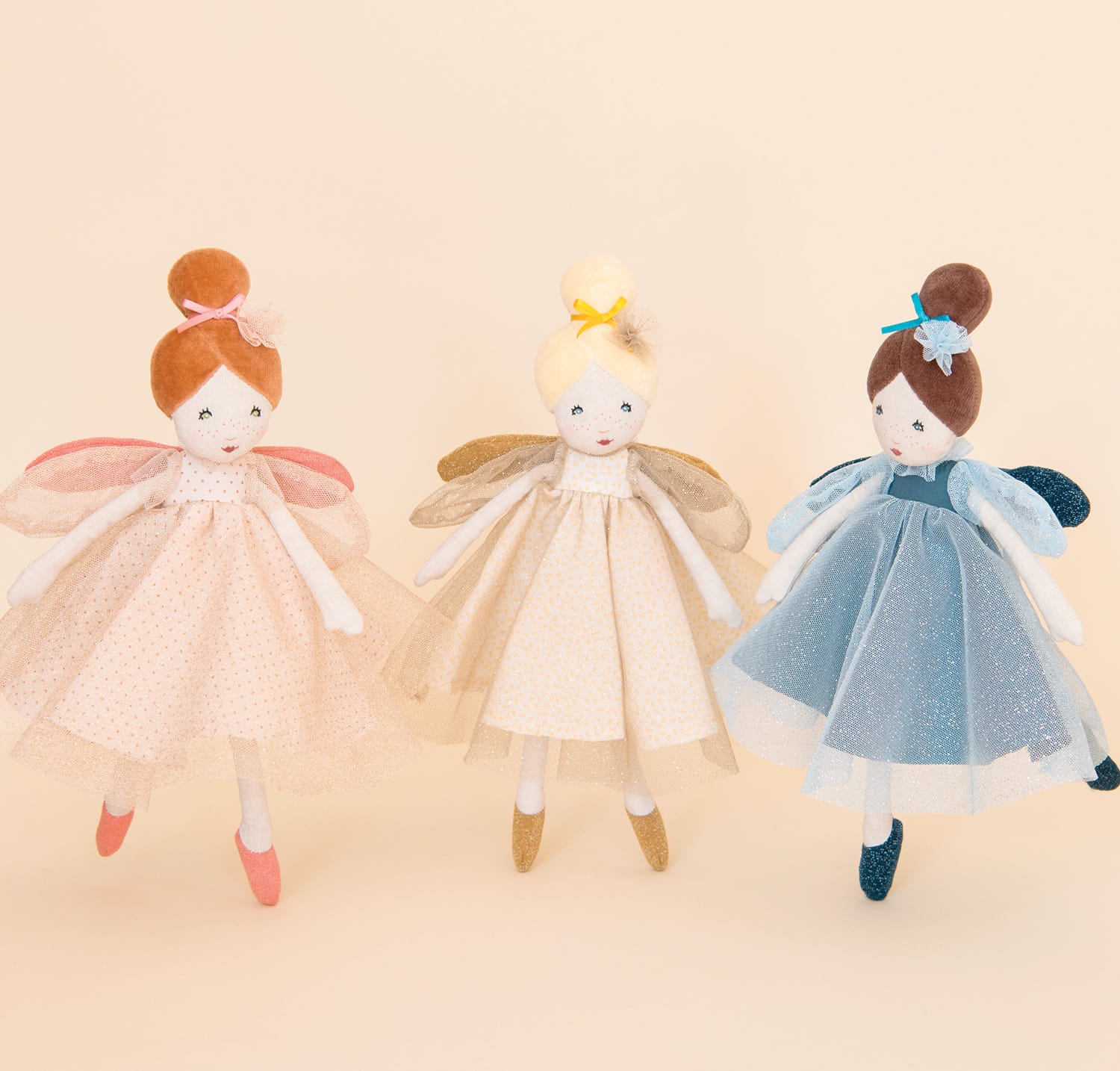 La fatina indossa un abito in tulle colorato rosa con brillantini e i suoi capelli rossi sono legati con un fiocco rosa. Ha una delicata faccia ricamata e serigrafata.