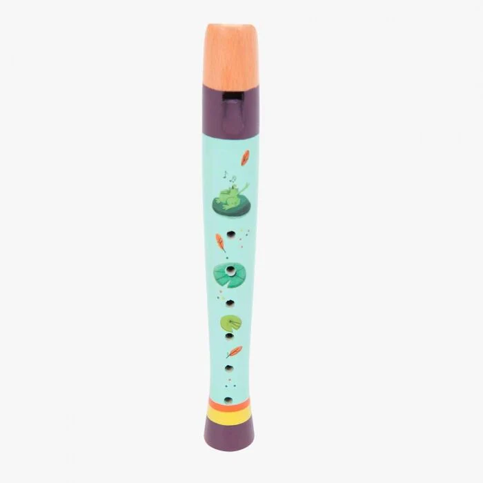 Flauto in legno a 6 fori, colorato nei toni del verde acqua e viola, con illustrazioni allegre e danzanti con piume disegnate e coriandoli. Aiuterà i più piccoli a sviluppare il ritmo e la consapevolezza musicale ed è adatto alle manine dei più piccoli a partire dai 2 anni di età.