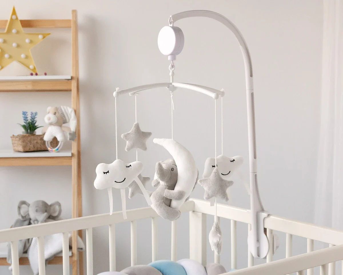 L’ orsetto, le nuvole e le stelle ruotano molto lentamente sul nostro lettino, con una ninna nanna per rilassare il bambino.