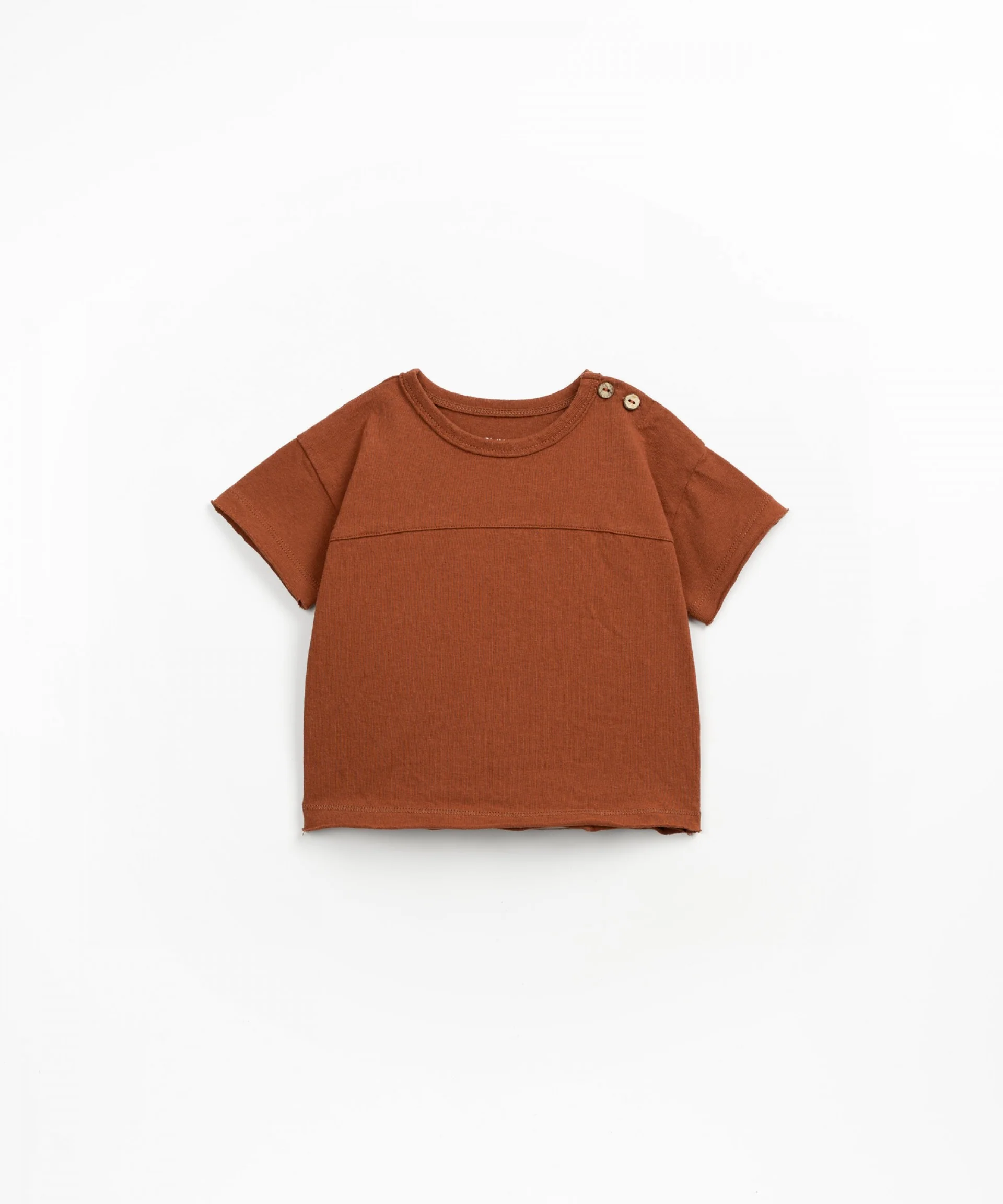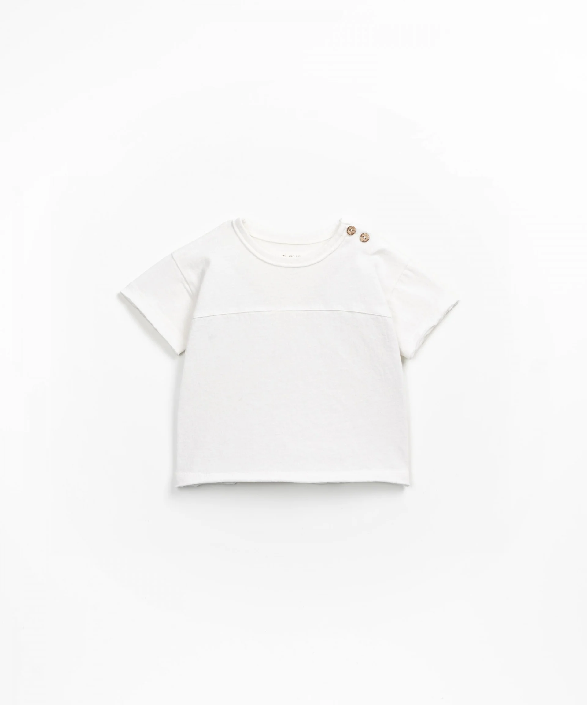 Maglietta taglio dritto, maniche corte, scollo rotondo, dettaglio a contrasto sulla parte superiore e apertura sulla spalla con bottone in cocco.