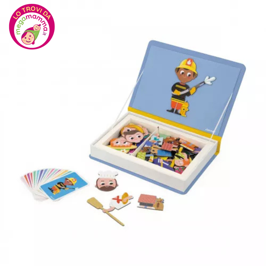 Perché non inventare nuovi mestieri? Quale sarà il più originale tra quelli creati dai bambini? Con questo Magnéti’Book dedicato ai mestieri, i bambini dai 3 anni in su non solo scopriranno 16 professioni, ma potranno inventarne molte altre! I Magnéti’Books sono cofanetti che contengono numerose calamite da posizionare su una superficie magnetica. In un primo tempo, i bambini si divertiranno a riprodurre le carte modello trovando gli elementi giusti e posizionandoli nei punti corretti. Quindi potranno dare libero sfogo alla propria immaginazione e creare nuovi mestieri mescolando i magneti! Il pratico cofanetto si chiude facilmente per riporre i 48 magneti e le 16 carte di gioco e poterli trasportare ovunque! Questo gioco educativo magnetico è fabbricato in cartone FSC®.