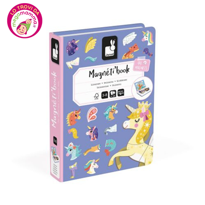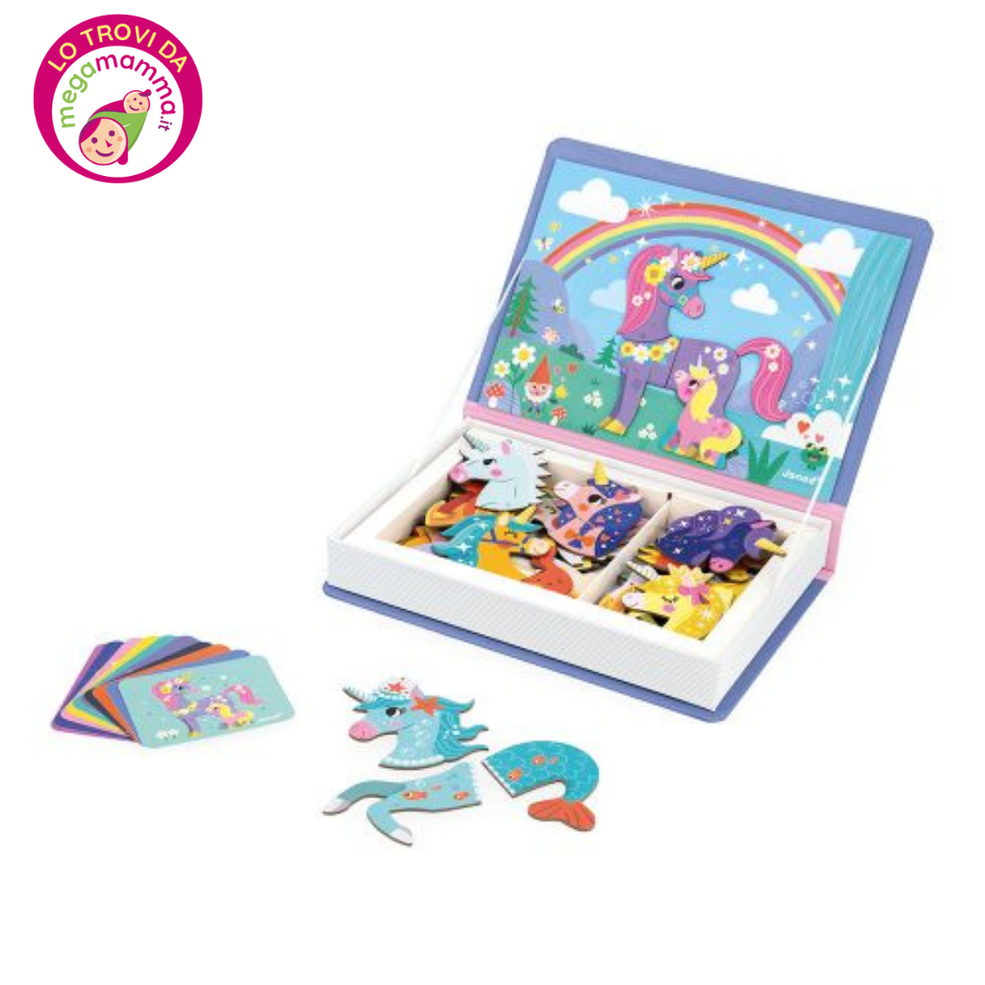 Maestosi e fantastici, gli unicorni sono davvero creature magiche! Questo gioco educativo magnetico trasporterà i bambini dai 3 anni in su in un mondo da favola. Stimolare l’immaginazione è un’attività fondamentale per la crescita: con l’aiuto di questo Magnéti’book, il bambino si divertirà a inventare storie sempre nuove. Potrà fare riferimento ai modelli e alle illustrazioni colorate, oppure dare libero sfogo alla sua fantasia mescolando le calamite a suo piacimento. Questo gioco magnetico include 44 pezzi calamitati e 10 modelli magnificamente illustrati. Ogni unicorno è diverso dagli altri. Le diverse decorazioni e le numerose calamite permettono un’infinità di abbinamenti sempre nuovi. Un unicorno con le ali o con le pinne, in mezzo a un prato o nel cielo… Tanti mondi incantati prenderanno vita tra le mani del bambino. Le calamite, facili da afferrare anche per i più piccoli, permettono di esercitare le abilità fino-motorie. Questo giocattolo magnetico, che ha la forma di un libro, è ideale per essere portato ovunque. L’immaginazione non avrà limiti all’interno di un fantastico universo. Questo magnifico gioco magnetico è l’ultimo arrivato della collezione Magnéti’book di Janod, che include anche animali, mestieri e vigili del fuoco. Questo gioco educativo magnetico è fabbricato con cartone certificato FSC™ e materiali controllati.