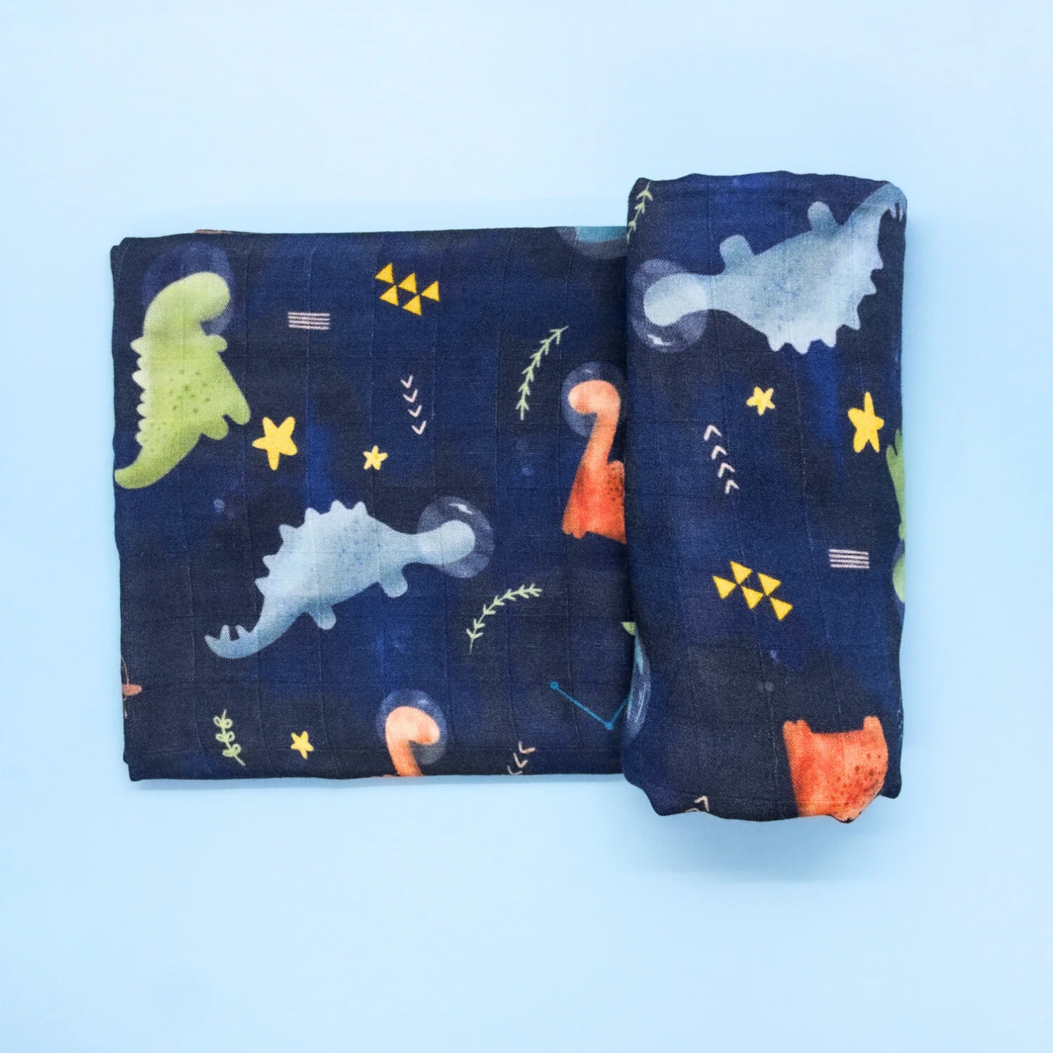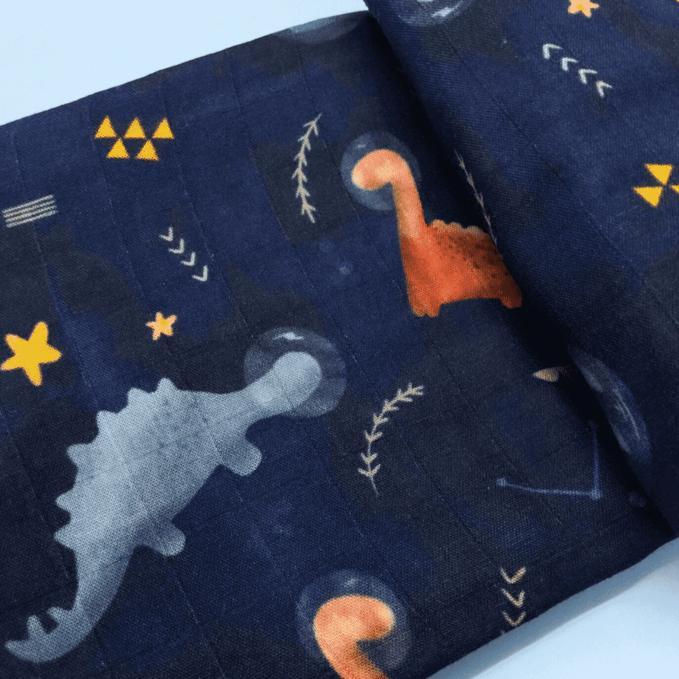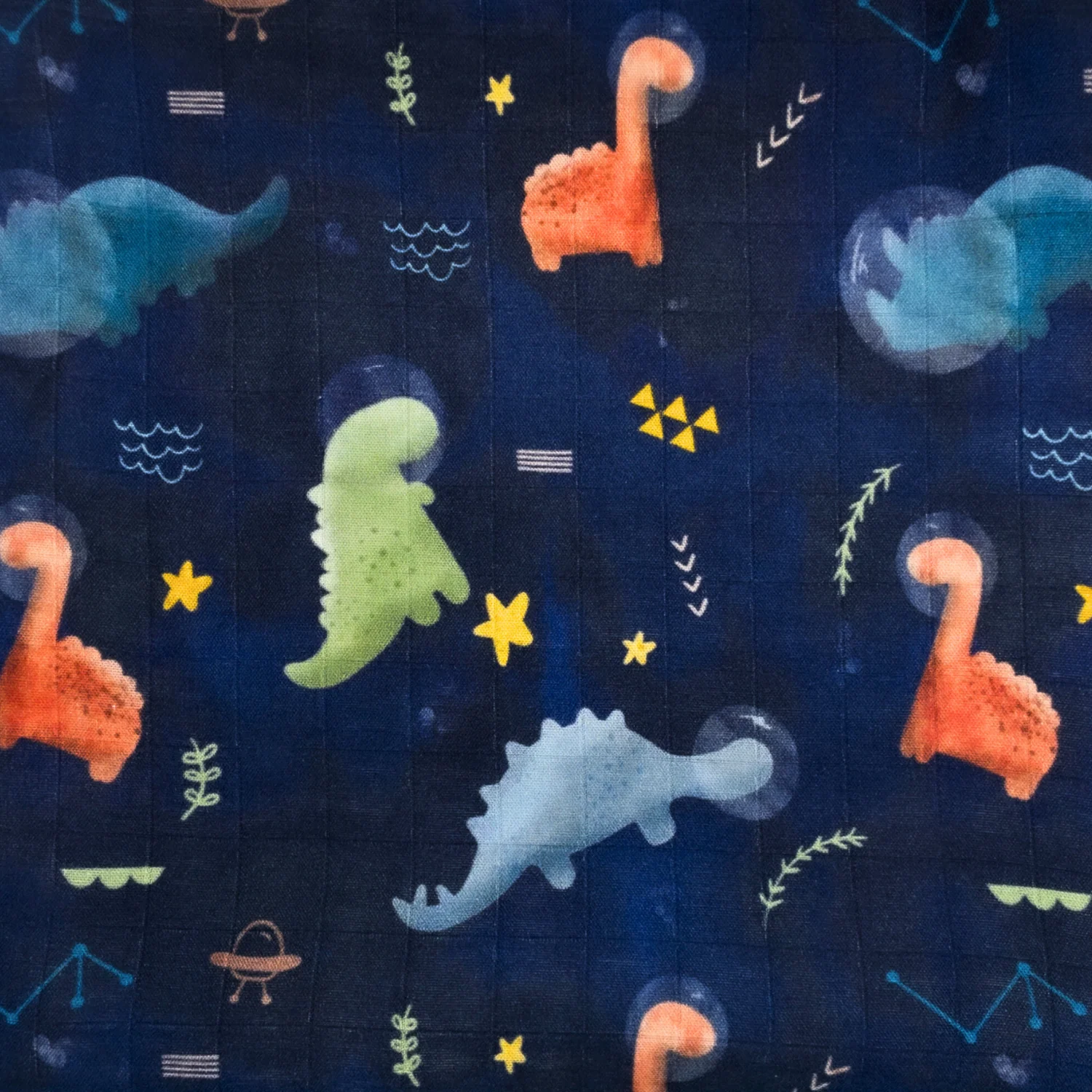 Le mussole bamboo Space-Dinos sono realizzate in una combinazione di cotone e bambù, garantendo una traspirabilità ottimale e morbidezza, ideali per le pelli delicate dei neonati. La fantasia blu con i dinosauri a spasso nello spazio dona un tocco originale e divertente.