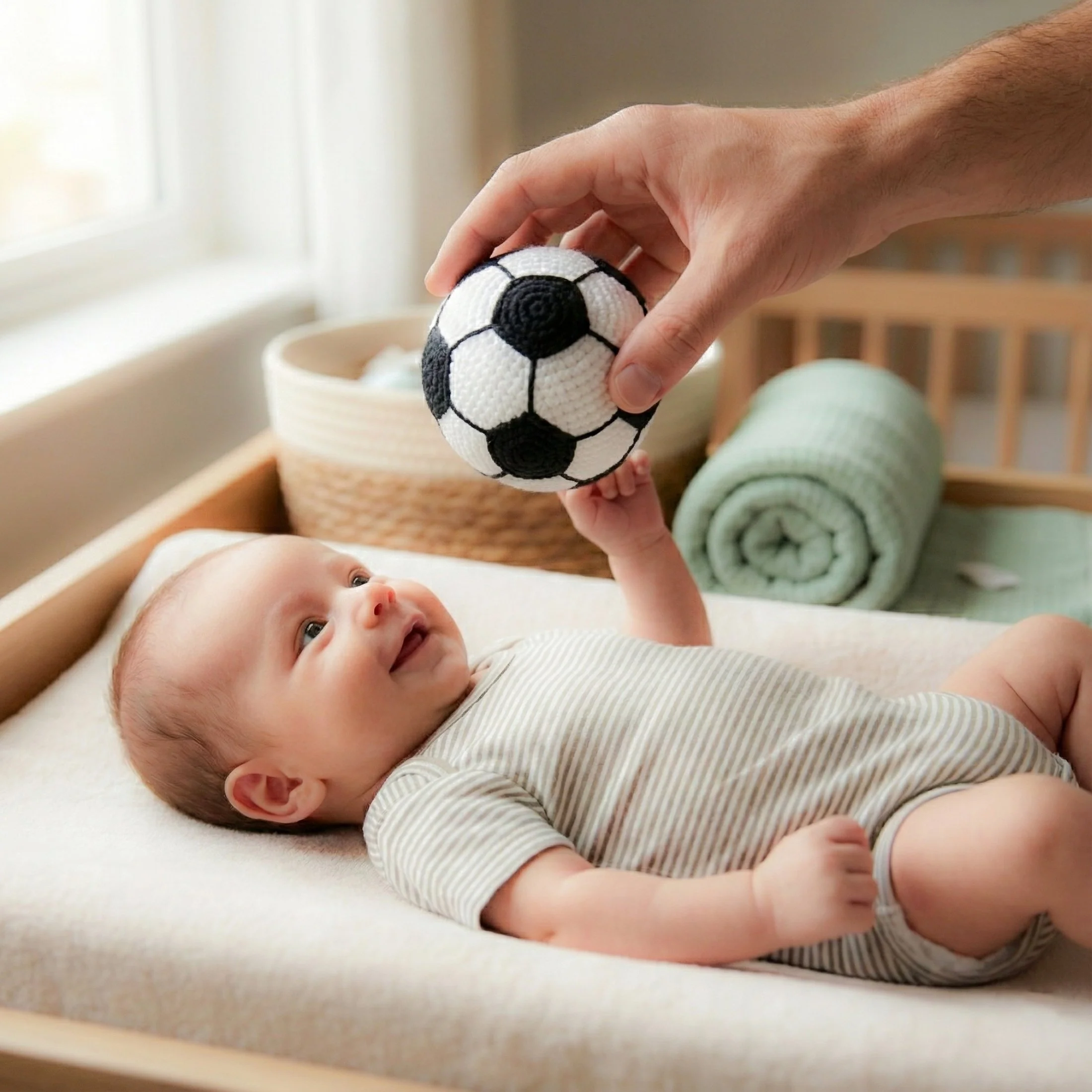 • Design Unico: I dettagli a uncinetto riproducono una palla da calcio con un diametro di 9 cm circa, un modo simpatico per accompagnare il neonato nelle sue prime scoperte sensoriali.