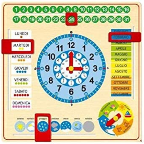Un orologio e calandario in legno di grande dimensioni per segnare il giorno, il mese, la stagione e il tempo. Uno strumento di apprendimento per i bambini, robusto e stimolante, che insegna il concetto del tempo con più facilità e divertimento, posizionando le tessere scorrevoli sui mesi, stagioni, giorni e stato metereologico. OBBIETTIVO: apprendere giorno dopo giorno il concetto di tempo e le sue suddivisioni Dimensioni: cm44x44x3 cm