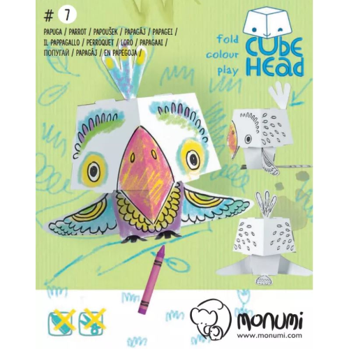 Modello in cartone di un pappagallo. Testa cubica da piegare e colorare, misura S. Realizzata in cartone ondulato laminato con carta goffrata bianca . Può essere assemblato senza l’uso di forbici o colla. Modello adatto per la colorazione con pastelli, pennarelli, pennarelli e tempere. La carta assorbe bene l’acqua, non si sgualcisce, non perde. Dimensioni del prodotto: 20,0 x 25,0 x 21,0 cm
