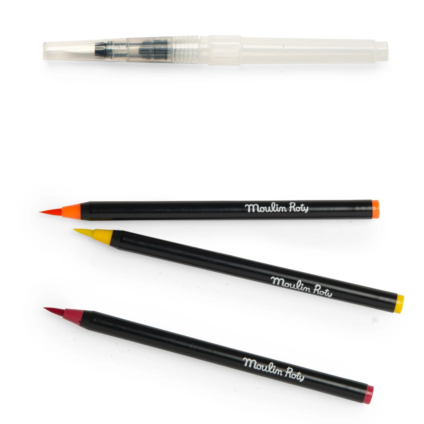 Disegna con i tuoi pennarelli-pennello poi, subito dopo, ripassa il disegno con il pennello a serbatoio d’acqua per ottenere un effetto acquerello.
