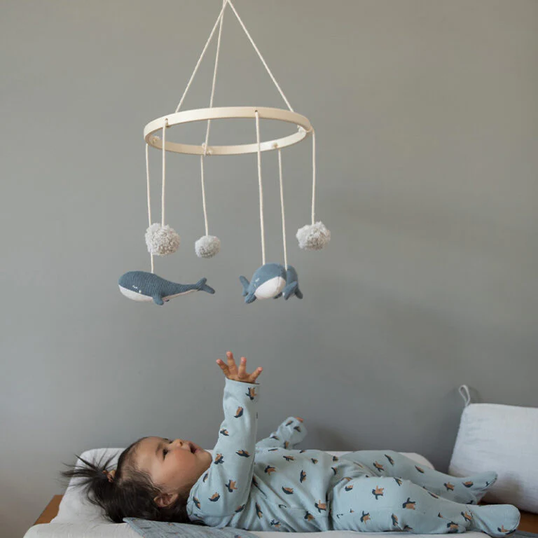 Trixie Giostrina in Legno Balena presenta 3 palline pompon e 3 balena realizzate in cotone biologico e lavorate a maglia.