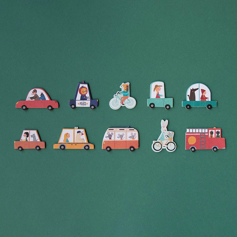 Autisti prudenti, ciclisti felici e camion pieni di gelato… La strada non finisce mai! Una volta completato il puzzle, c’è un piccolo gioco da fare. Quale giocatore sarà il primo a trovare tutti e 10 gli automobilisti? Un puzzle tascabile da 24 pezzi di auto e biciclette. Un gioco di osservazione da portare ovunque! Delicato e realizzato in Europa.