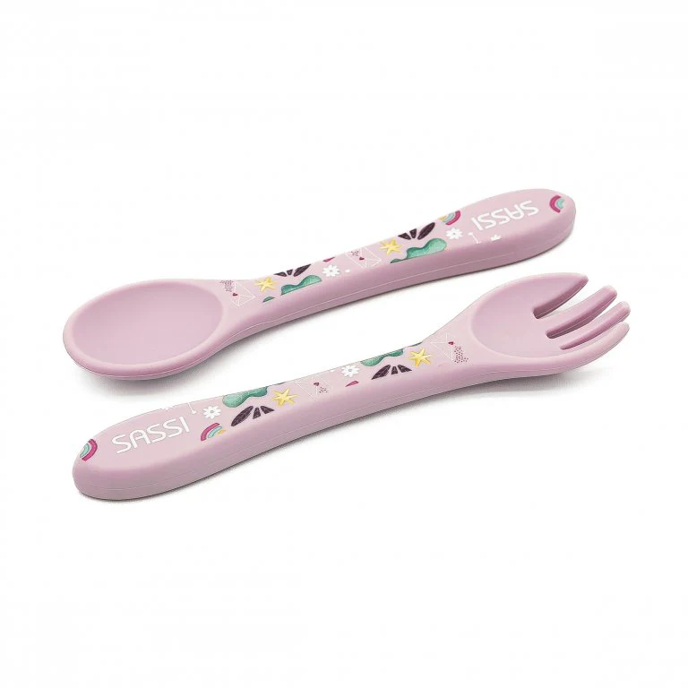 Posate in silicone per lo svezzamento decorate con il grazioso unicorno Sparkly.
