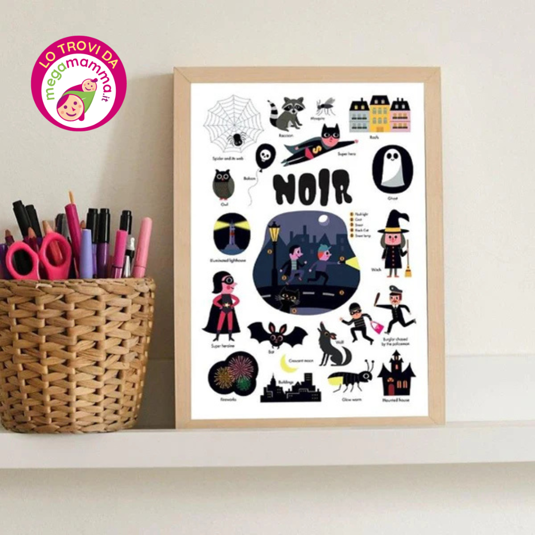Giocare a spaventarsi… con adesivi raffiguranti le splendide opere d’arte di D. Balisevic e S. Bessard. Con questo piccolo poster educativo, i bambini si divertiranno con tutto ciò che fa paura: fantasmi, pipistrelli, gatti neri o ladri… Attaccheranno gli adesivi da soli su un poster A4, che decorerà la stanza. Facile e molto divertente!