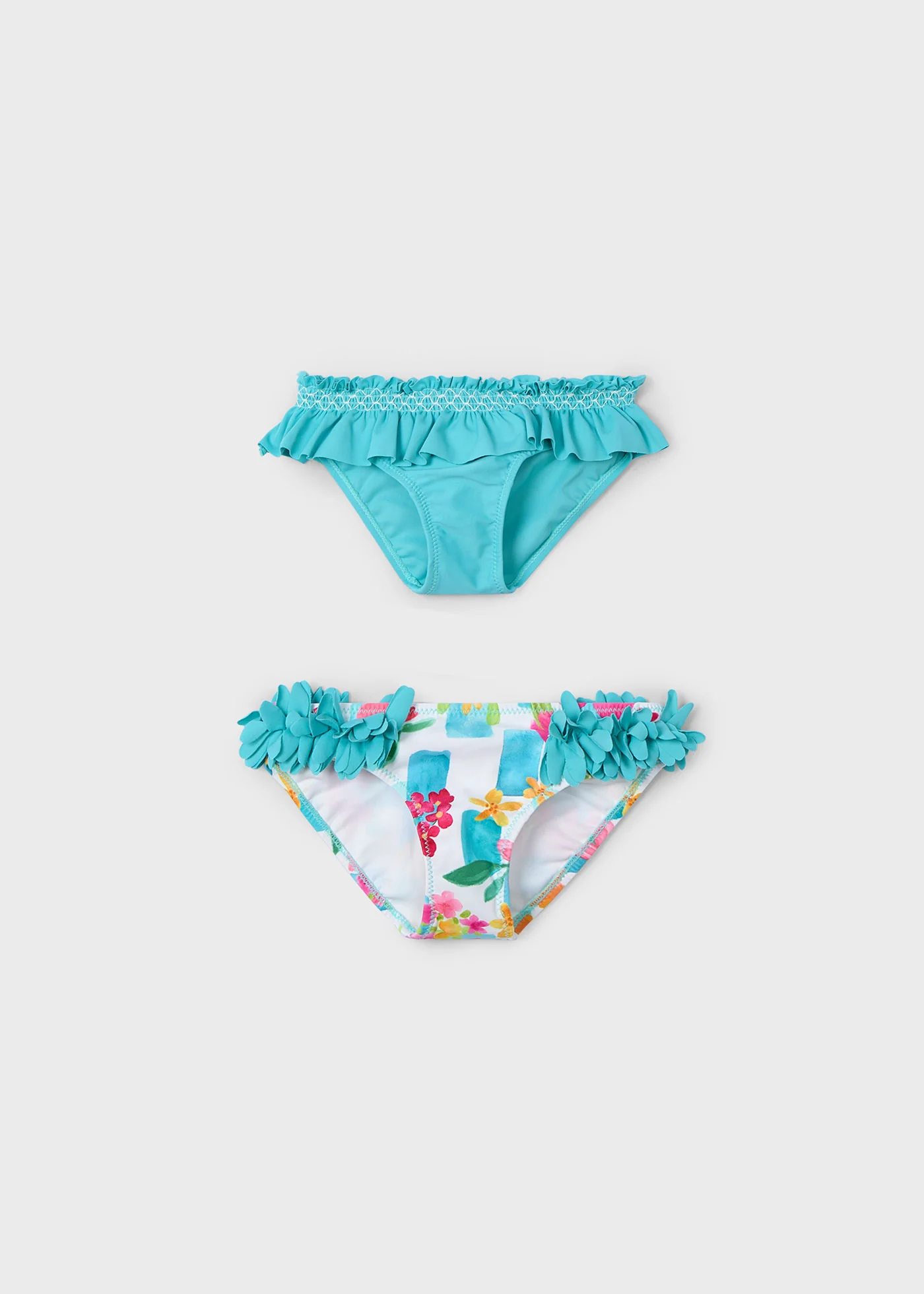 Set composto da 2 costumi da bagno, uno tinta unita con volant e uno con stampa floreale e fiori sui lati, entrambi con fascia elastica in vita.