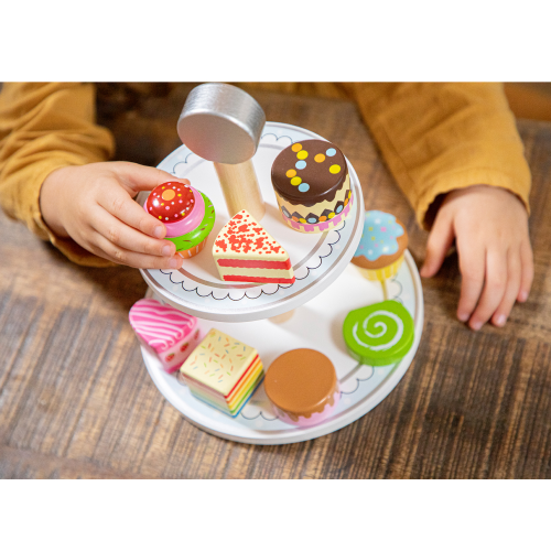 Goditi un tè pomeridiano con questa bella e ricca etagère. L’etagère è completa di 8 torte diverse, tra cui un punto di torta red velvet, un muffin e una torta arcobaleno. In questo modo, bere il tè con il tuo orsacchiotto nel pomeriggio diventa una vera festa! Perfetto per incoraggiare la condivisione e interpretare ruoli fantasiosi. Una fantastica aggiunta a qualsiasi cucina giocattolo in legno. Le forme in legno possono essere facilmente afferrate e sono molto adatte ai bambini. Inoltre, giocare con questo set stimola lo sviluppo delle capacità motorie fini.