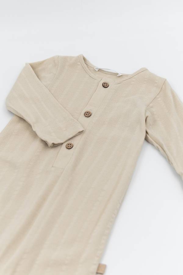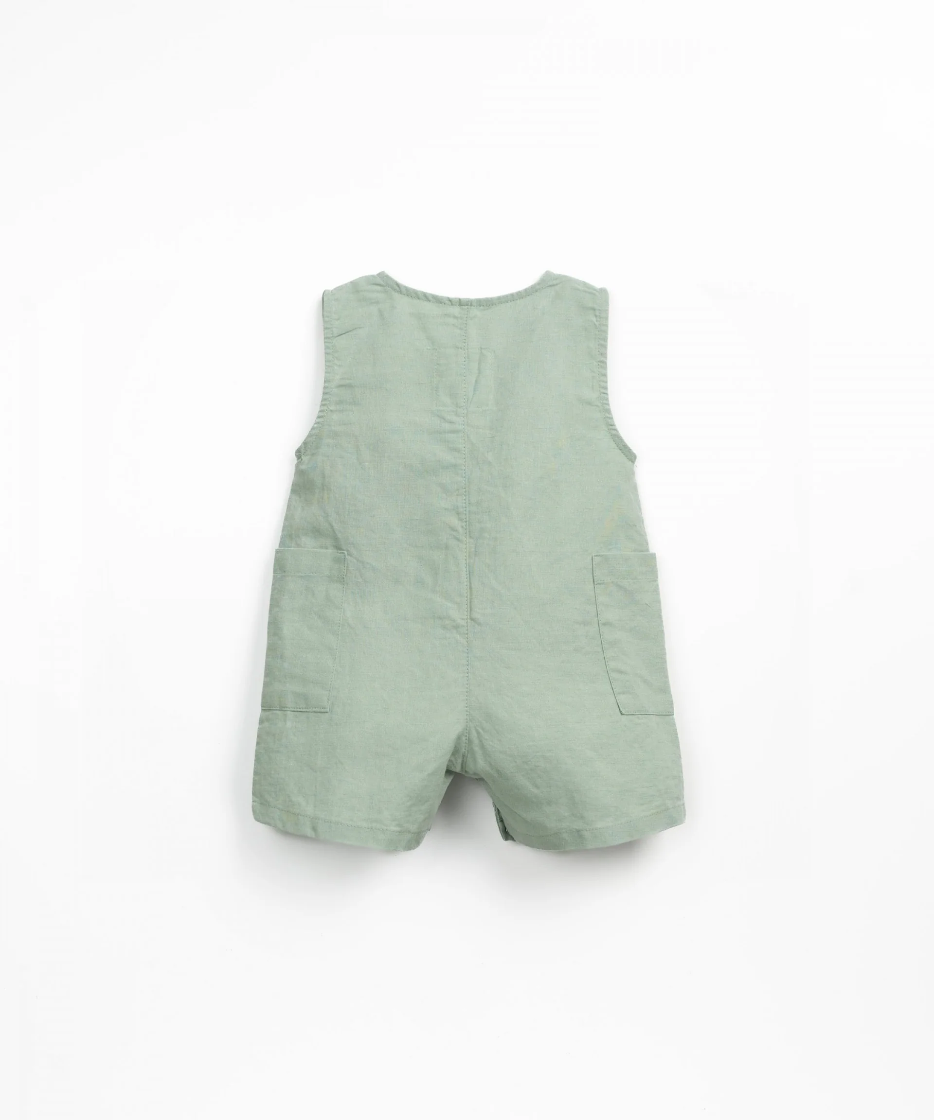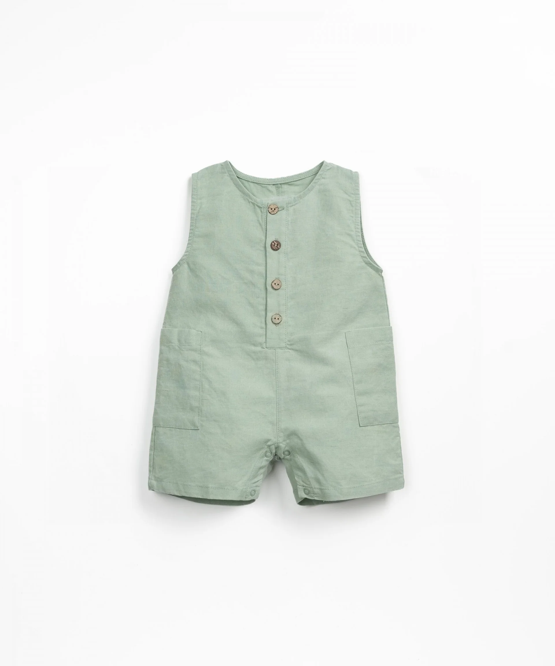 Tutina modello senza maniche, con scollo rotondo, bottoni in cocco, due tasche laterali e parte inferiore a forma di pantaloncini.