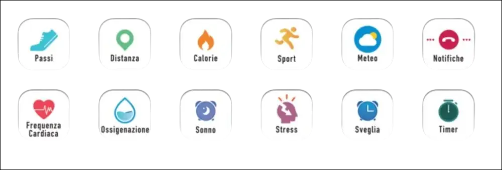 Funzioni : notifiche, frequenza cardiaca, livello di stress e analisi del sonno, misurazione del livello di ossigenazione nel sangue, contapassi, calorie bruciate, meteo, musica, sveglie e timer;