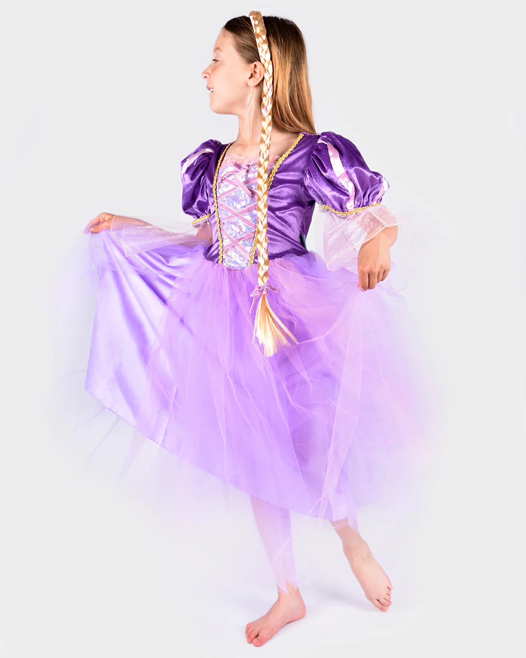 LOWA è il nostro magico abito viola ispirato a Rapunzel che è una vera bomba da favola. L’abito ha un corpetto di velluto scintillante, con un corpetto di paillettes e dettagli in raso e organza. Maniche corte con ampie estremità in organza. Forse la cosa più magica di questo vestito, tuttavia, è l’ampia e soffice gonna in tulle a strati. Impossibile non girare e piroettare dentro! Inoltre, ottieni un diadema con una treccia molto lunga con dettagli floreali.