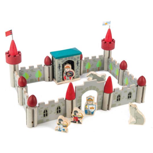Castello in Legno Del Lupo proteggi il tuo castello e sconfiggi il tuo nemico! Questo set include soldati rossi e blu in diverse posizioni, un arco, un blocco carcerario e 2 lupi. Questo set di base ha tutto ciò di cui hai bisogno per creare e costruire il tuo layout di castello unico, ritagliando muri e pali con piccoli pioli di plastica ordinati.